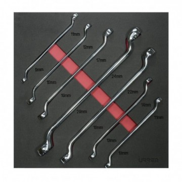 -Contenido: 7 llaves de estrías 45° métricas-Medidas: 9 x 11 mm – 10 x 11 mm – 12 x 15 mm – 13 x 14 mm – 16 x 17 mm – 19 x 22 mm – 24 x 26 mm-Bandeja de 36 x 36 cm fabricada en EVA