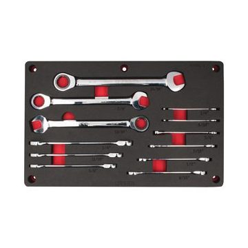 -Juego de llaves combinadas tipo matraca, pulgadas, pulido espejo, con bandeja de espuma EVA diseñada para fijarla en la pared, manteniendo la herramienta en su lugar aunque este en posición vertical.-Mecanismo de 72 dientes, recuperación de 5°. Exceden norma ASME.-Funciona con espárragos largos, aún donde los dados largos, no llegan.-Dimensiones de boca: 5/16″, 3/8″, 7/16″, 1/2″, 9/16″, 5/8″, 3/4″, 1/4″, 11/16″, 13/16″, 7/8″, 15/16″.-Ideales para realizar trabajos de mecánica en general.