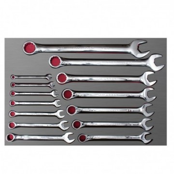 -Alto grado de control, organización y protección en las herramientas del taller o de la línea de producción. -CONTENIDO: Llave combinada: 5/16″, 3/8″, 7/16″, 1/2″, 9/16″, 5/8″, 11/16″, 3/4″, 13/16″, 7/8″, 15/16″, 1″, 1-1/8″, 1-1/4″.-Garantizar que las piezas no se salgan de su posición con el movimiento.-Incluye gravado de la medida del producto para fácil identificación.-Consiste en una bandeja de 2 capas de espuma de EVA de 16 mm de espesor. La primera capa es la base de 6 mm de espesor y la segunda capa de 10 mm.-Juego de dados con sistema de organización de herramientas basado en bandejas fabricadas en espuma de EVA que cuentan con cavidades específicas para cada tipo de herramienta.
