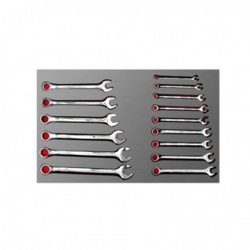-Alto grado de control, organización y protección en las herramientas del taller o de la línea de producción. -CONTENIDO: llave combinada: 7mm, 8mm, 9mm, 10m, 11m, 12m, 13m, 14m, 15m, 16m, 17m, 18m, 19m, 20m, 21m.-Garantizar que las piezas no se salgan de su posición con el movimiento.-Incluye gravado de la medida del producto para fácil identificación.-Consiste en una bandeja de 2 capas de espuma de EVA de 16 mm de espesor. La primera capa es la base de 6 mm de espesor y la segunda capa de 10 mm.-Juego de dados con sistema de organización de herramientas basado en bandejas fabricadas en espuma de EVA que cuentan con cavidades específicas para cada tipo de herramienta.